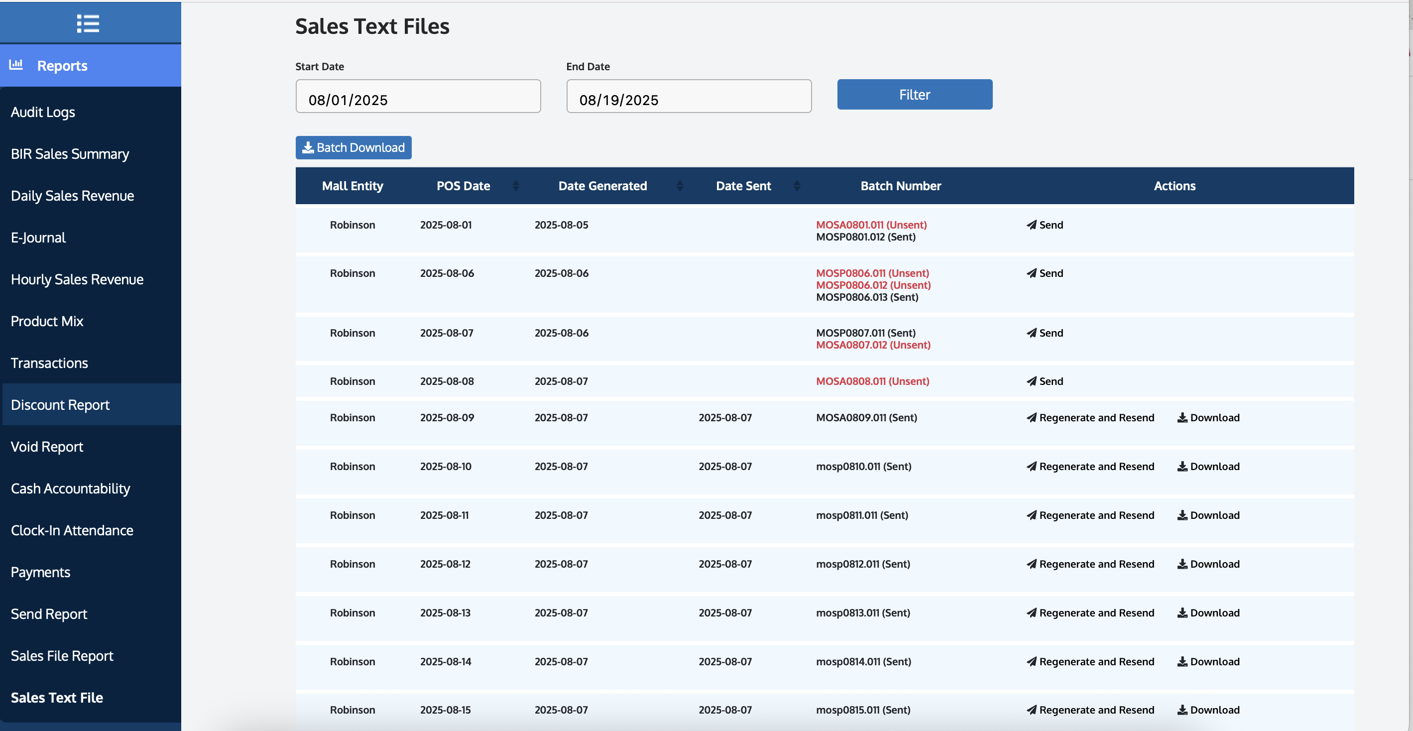 | Batch Send | Send option will show up if sales files were generated but failed on sending. Batch Send will send all unsent sales files that are displayed on the view table |