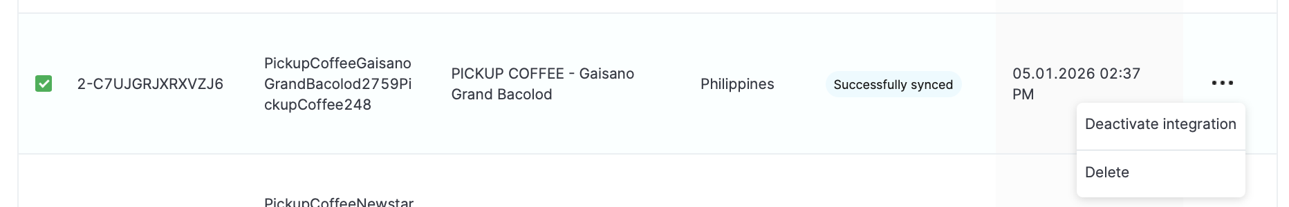 - Once you see the store that you want to deactivate, click on the three dots at the last column. It will show options to Deactivate integration or Delete the store entry. Click "Deactivate integration" to proceed on deactivation.
