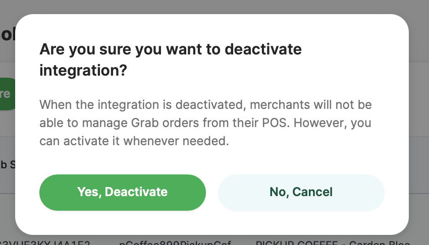 | For now, Grab doesn't have an API available for deactivating integration hence all deactivation should be done on the Grab Developer Portal |