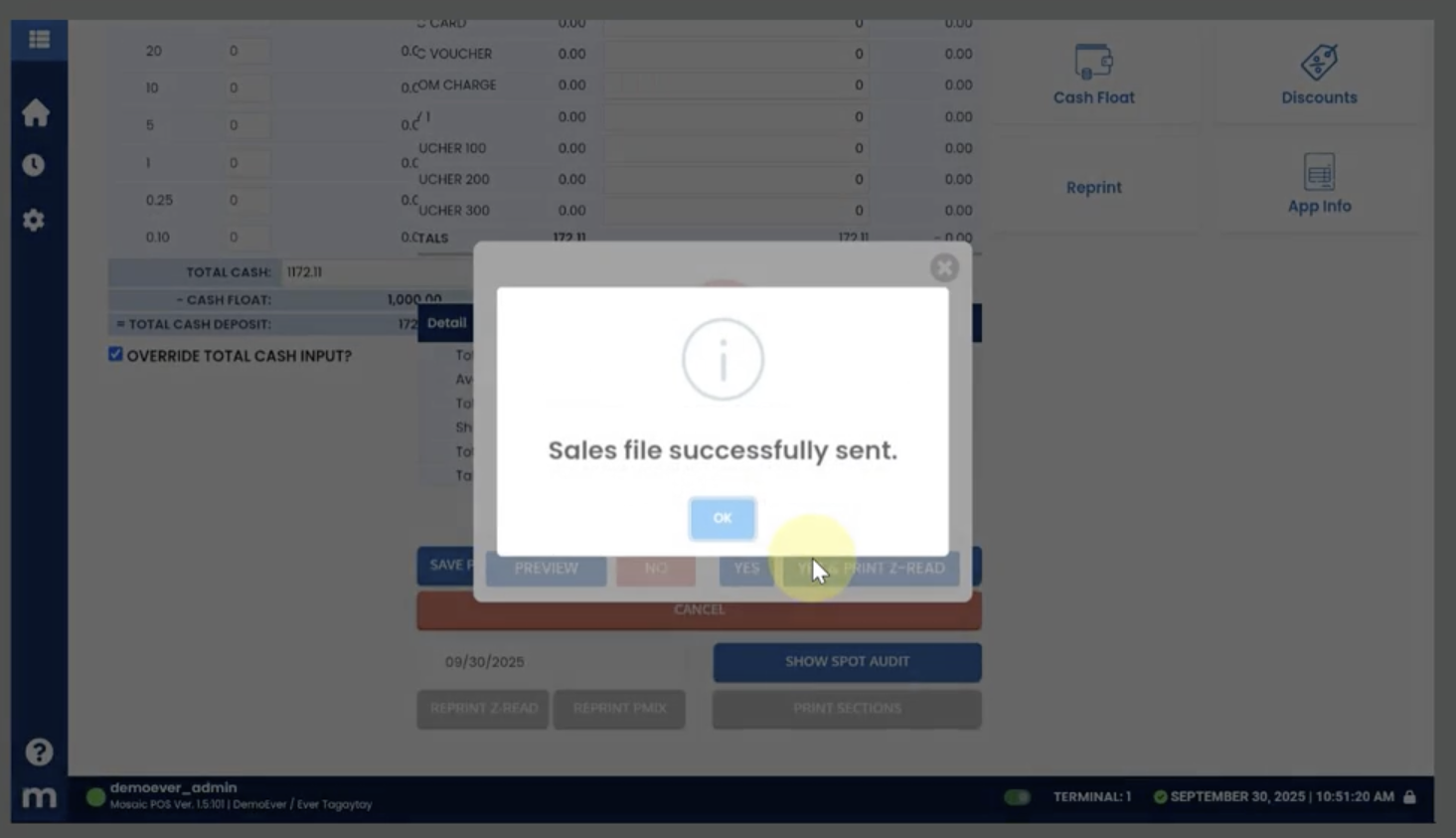 | Day End > Send status dialog | Sales file will be sent during day end process wherein a confirmation dialog will pop up on the screen